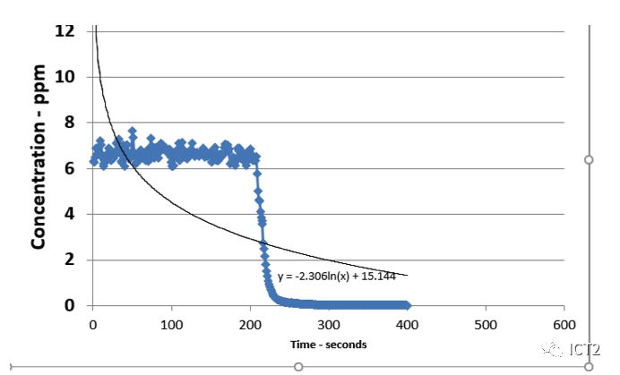 换气效率测试用流速测量,通风柜内部气体浓度为5 ~ 8 ppm,这个浓度在设备气道轴环处测量。当达到稳态浓度时,关闭气体。浓度/时间数据被记录,直到室内通风柜SF6浓度达到稳态值的20% ~ (1 - 2ppm)。